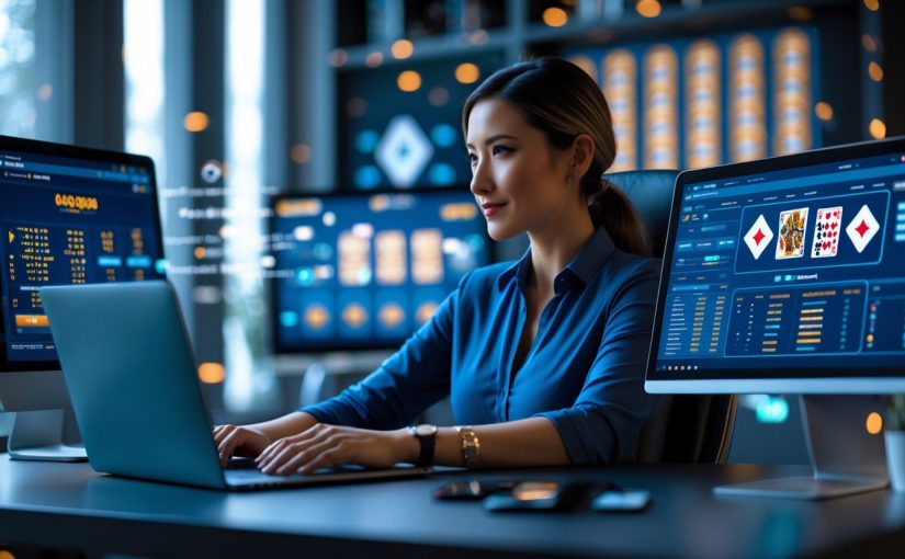 Seorang pemain baccarat online berpengalaman duduk di meja kerja dengan beberapa layar komputer menampilkan permainan baccarat dan statistik.