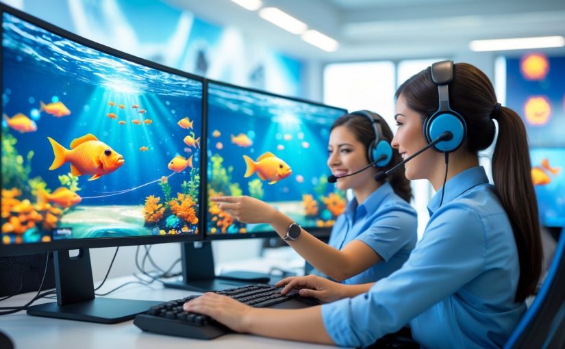 Seorang customer service dengan headset membantu pemain di depan komputer dengan layar menampilkan permainan menembak ikan dalam suasana kantor yang terang.
