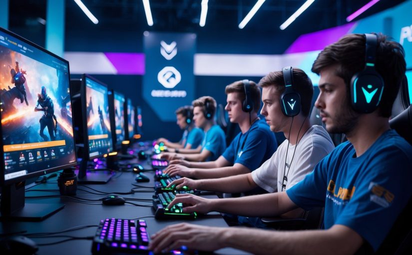 Sejumlah orang muda sedang bermain game esports dengan komputer modern di ruangan gaming yang terang dan teratur.